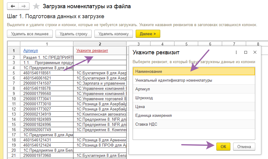 Указываем, что какой колонке соотвествует. Колонки должны быть все сопоставлены. Обратите внимания, если в таблице есть поля с пустым наименованием, то такая строка при загрузке будет игнорироваться. Можно воспользоваться кнопкой "удалить все лишнеее".